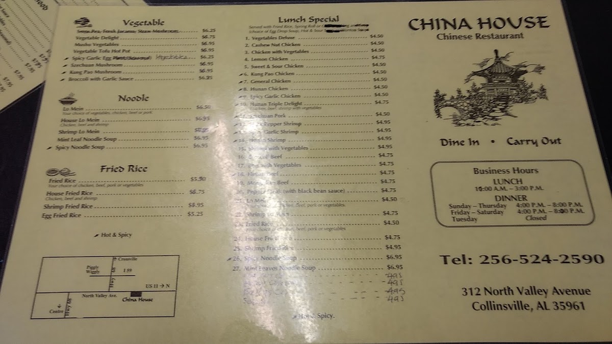 Welcome to China House Restaurant - Collinsville, a hidden gem tucked away in Collinsville, Alabama. Here, the menu features a delightful array of Chinese culinary classics that will tantalize your taste buds. Each dish is served with a generous portion of rice, ensuring a fulfilling experience.
